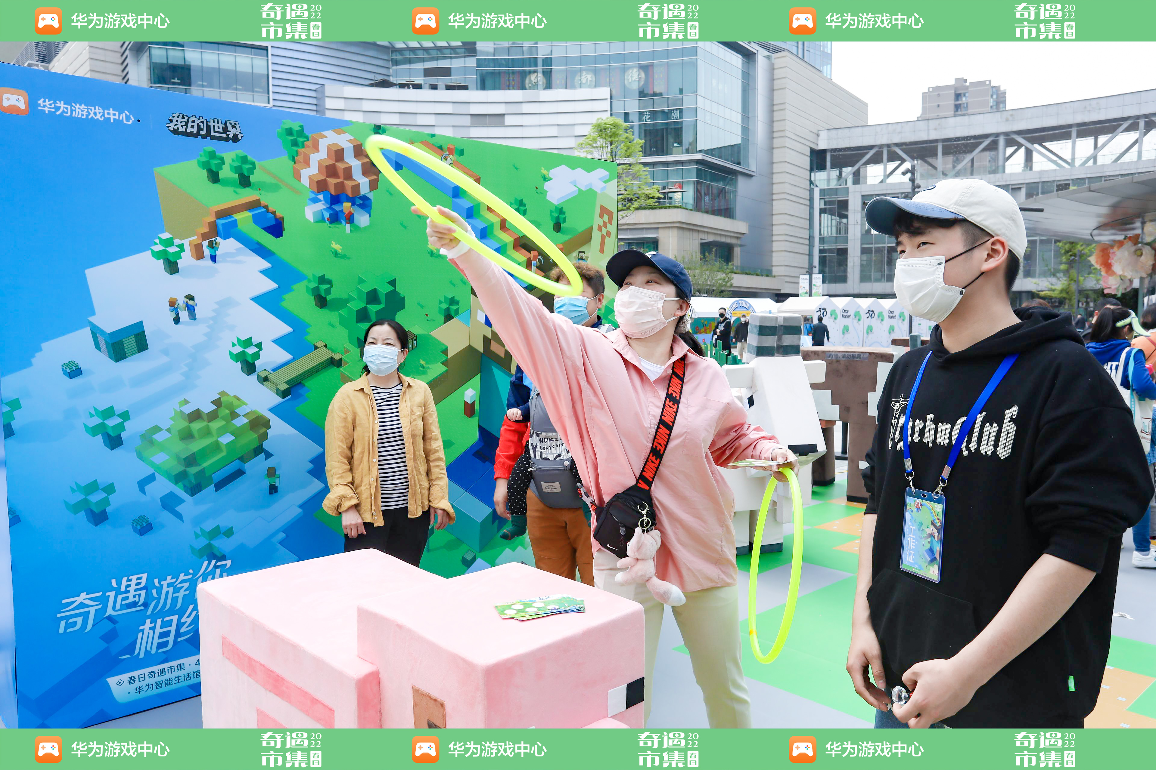 华为游戏中心《我的世界》春日奇遇市集落地华为智能生活馆·成都万象城,商圈快闪以方块世界为主题,还原游戏世界场景,结合游戏玩法设置击败苦力怕、趣味套山羊等趣味互动,突破次元限制让玩家在现实世界体验游戏冒险。活动现场见到了不少家庭结伴来体验的。